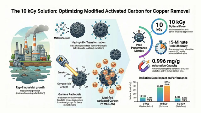 Hasilnya menunjukkan bahwa karbon aktif yang telah dimodifikasi mampu menyerap logam tembaga secara lebih cepat dan efektif dibandingkan karbon aktif biasa. Kondisi optimal dicapai pada waktu kontak 15 menit dengan dosis iradiasi gamma 10 kGy, dengan kapasitas adsorpsi yang lebih tinggi.