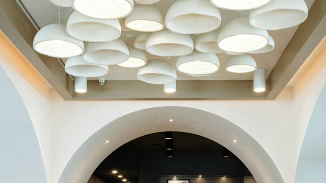 Permukaannya terlihat natural dan mentah ini menyerupai beton dari kejauhan tetapi faktanya lampu ini sangatlah ringan. Tekstur dan polanya pun sangatlah unik bisa menambah karakter pada desainnya sekaligus memberikan nuansa yang hangat pada cahaya yang tersebar dalam ruangan.