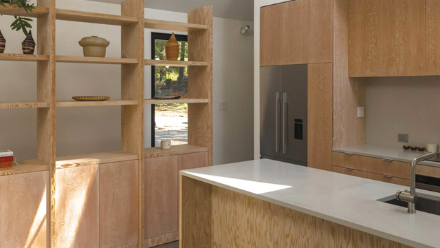 Suasana interior juga terlihat minimalis dan rumah ini mampu menampung tiga orang dengan nyaman. Jendela-jendela besar membentang di seluruh rumah, membuat sinar matahari dapat masuk ke ruangan secara maksimal. Sehingga, Forest House terbilang hemat energi karena tidak membutuhkan pencahayaan tambahan pada siang hari.