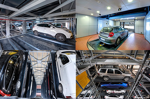 Mobil-mobil diangkut dengan lift otomatis. Berbeda dengan garasi atau tempat parkir pada umumnya, paparan emisi karbon yang dilepaskan dari kendaraan di gedung garasi ini lebih sedikit berkat dinding pemisah yang tebal dan segala komponennya yang canggih.