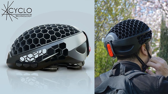Bentuk helm Cyclo memiliki desain unik yang menyerupai sarang lebah, mudah dikemas dan bisa dimasukan ke dalam tas. Meskipun terbuat dari plastik daur ulang, konstruksinya tetap menghadirkan gaya, keamanan, dan kenyamanan saat dipakai. Selain itu, helm ini memiliki ketahanan yang melebihi semua standar helm di AS, Eropa, dan Kanada.