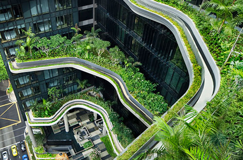 Dedaunan dari tanaman yang ada di sekitar gedung juga bekerja menyerap panas dan menjaga dinding tetap sejuk (ini suatu keharusan untuk iklim tropis seperti di Singapura). Tetapi, mungkin Anda bertanya-tanya berapa besar energi yang diperlukan untuk menyiram dan memelihara semua tanaman tersebut. Jawabannya? Nol energi.