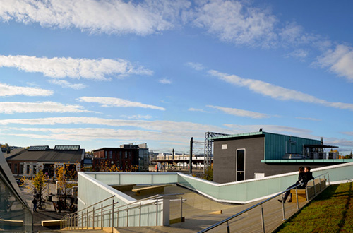 Pada bagian taman di atapnya ditanam semak-semak berbunga yang menyerap air hujan dan memberikan insulasi dari temperatur di luar bangunan. Solusi tersebut diterapkan untuk menekan efek cuaca ekstrim baik panas maupun dingin. Pemakaian dinding kaca di bangunan serta penghawaannya yang alami, konsumsi energi bangunan ini sangat rendah dan hanya membutuhkan sedikit energi untuk pencahayaan di malam hari.