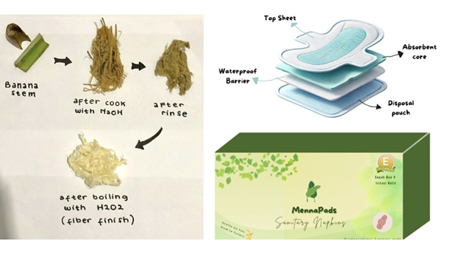 Kedua, Mennapads memanfaatkan limbah pertanian, khususnya pelepah pisang sebagai bahan baku utama. Pelepah pisang tersebut mereka olah menjadi lapisan penyerap alami yang menggantikan bahan sintetis dalam pembalut.