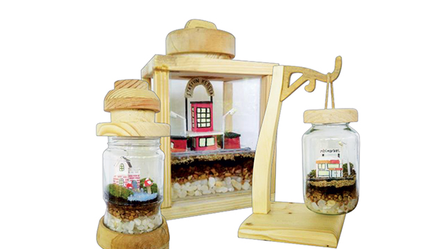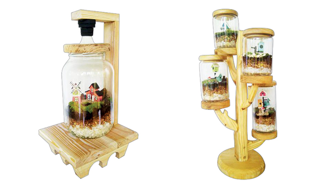 Selanjutnya, kayu dicat menggunakan cat acrylic dan cat fosfor. Kemudian diakhiri dengan penyemprotan spray paint clear doff. Dalam pembuatan terarium berbentuk rumah kurcaci, limbah kayu dibentuk seperti lentera dan dihubungkan dengan botol kaca sebagai wadah tanaman menggunakan pengait.