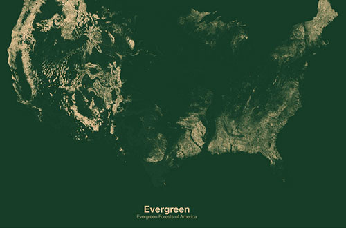 Peta karya Michael Pecirno ini berjudul “Minimal Maps”. Pecirno membuat sebuah serial gambar yang memetakan bermacam aspek di lanskap Amerika. Pecirno, yang sedang meneruskan studi masternya di Royal College of Art, menggunakan data dari Departemen Pertanian Amerika dan mengisolasi tanaman tertentu dan melukisnya menjadi serial gambar yang unik.