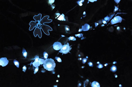 Lebih dari seribu bunga lampu LED dari botol plastik dibuat dengan tangan. Setiap botol plastik dipotong dan digunting menjadi bentuk bunga yang berbeda-beda. Sebagian boesar “bunga” ini kemudian ditempelkan pada sebuah pohon magnolia berukuran besar tanpa daun, sementara sisanya diserakan di bawah pohon agar terlihat seperti bunga yang telah gugur.