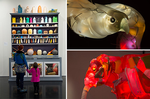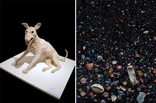 Kiri: “Cabinet of Marine Debris” (Mark Dion). Kanan atas: “Falcon” (Cynthia Minet). Kanan bawah: “Elephant” (Cynthia Minet). Sumber: www.huffingtonpost.com