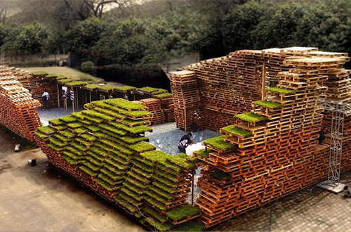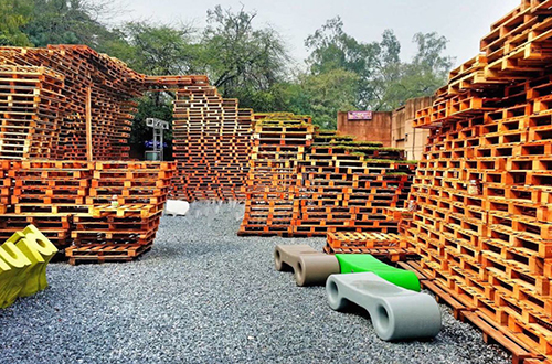 Lebih dari seribu palet bekas tidak terpakai disulap menjadi instalasi paviliun hijau di India. Instalasi temporer yang digunakan sebagai taman bermain dan tempat berkumpul tersebut diciptakan oleh firma arsitektur lokal, M:OFA Studios.