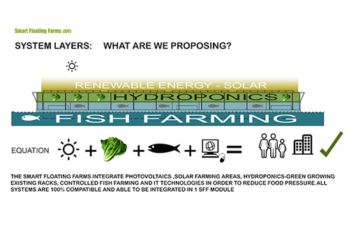 Smart Floating Farms (SFF) didesain sangat pintar dan beroperasi secara otomatis dengan mengombinasikan tenaga surya, pertanian hidroponik dan budidaya ikan. Menurut arsiteknya, proyek SFF ini dirancang untuk keperluan komersial dengan bahan-bahan dan teknologi yang sudah teruji. Kebun ini akan bisa digunakan di permukaan perairan untuk mengurangi ketergantungan terhadap makanan impor atau mengurangi jejak karbon pada makanan.