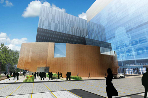 Para arsitek di Canon Design mendesain gedung ini dengan dinding kaca bening sebagai eksterior, dan akan memberikan ruang dengan kesan cerah dan bercahaya bagi pasien yang ada di dalamnya. Kaca yang dipilih untuk jendela adalah kaca tiga lapis yang membantu mengurangi penggunaan energi hingga lebih dari 40% dari batas standar.