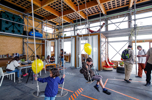 Seperti sebuah kotak dalam kotak, ruang publik ini memiliki banyak fungsi dan dapat disesuaikan untuk berbagai kebutuhan, seperti ruang pertemuan, ruang makan, ruang bermain, ruang dansa dan bahkan lapangan basket. Beberapa ayunan yang terbuat dari skateboard bekas menggantung dari rangka kayu penyangga atap panel surya.