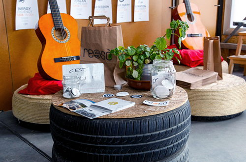 Ruang publik ini dilengkapi dengan mebel recycle dan upcycle, serta barang-barang koleksi, seperti kursi dari ban mobil bekas, kursi bekas, dan hammock yang dikumpulkan dari masyarakat sekitar. Material-material lain yang digunakan juga membuat bangunan ini menjadi murah dan mudah disesuaikan dengan kebutuhan.