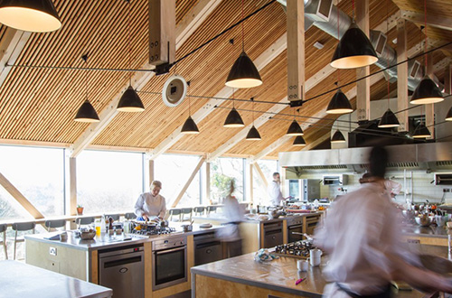 River Cottage Cookery School menawarkan kelas demonstrasi memasak dan mempromosikan perkebunan yang berkelanjutan oleh Chef Hugh Fearnley-Whittingstall. Interior bangunannya didominasi oleh kayu pinus, sementara kolom dan balok dari kayu pohon sejenis cemara menghadirkan suasana yang hangat. Lampu gantung menerangi meja kerja yang dilapisi baja tahan karat.