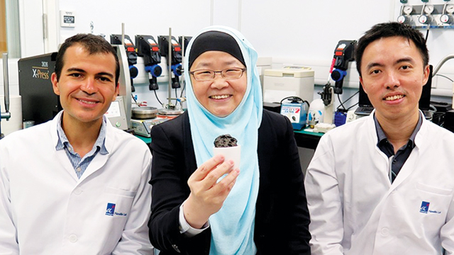 Para ilmuwan A*STAR dari kiri ke kanan: Dr. Ayman AbdelHamid, Prof. Jackie Y. Ying, dan Jian Liang Cheong. Foto: A*STAR