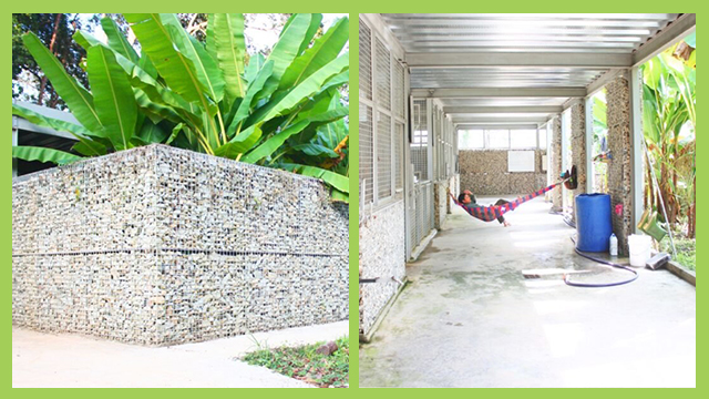 Dinding bronjong yang digunakan dalam tempat konservasi dirangkai dari jaring baja dan batu-batu yang bersumber di sekitar lokasi, ditumpuk satu meter dari garis atap untuk memungkinkan ventilasi silang. Sementara potongan atap memungkinkan cahaya alami masuk ke sarang beruang.