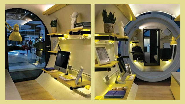 Pipa beton bekas berdiameter delapan kaki ini didesain untuk mengakomodasi satu hingga dua orang dengan perkiraan ruang tinggal sebesar 300 meter persegi. Interior dilengkapi dengan perlengkapan standar, sofa yang bisa menjadi kasur, kulkas mini, kamar mandi, shower, dan lemari untuk pakaian dan barang-barang pribadi.