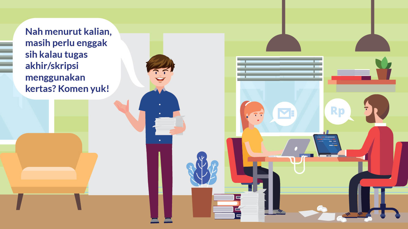 Tugas akhir /skripsi telah menjadi bagian dari perjuangan mencapai kelulusan. Tak sedikit kertas yang terbuang akibat revisi, setelah jadi pun terbengkalai begitu saja. Tahukah kamu, 1 batang pohon menghasilkan 16 rim atau 8.000 lembar kertas? Belum lagi emisi karbon yang dihasilkan untuk memproduksi kertas.