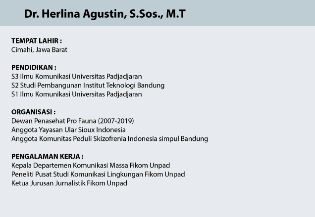 Selain aktif di Pusat Studi Komunikasi Lingkungan Unpad, Dr. Herlina juga tengah menyiapkan buku tentang komunikasi kebijakan konservasi. Dia pun baru saja pulang dari Maluku guna melakukan riset jurnalisme lingkungan.