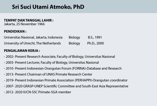 Hal tersebutlah yang membuat Dr. Sri Suci Utami Atmoko terpanggil untuk meneliti primata. Dosen di Universitas Nasional (Unas) ini mengawali sepak terjang penelitian primata sejak mengenyam pendidikan sarjana di Fakultas Biologi Unas. Dari situ, kecintaannya terhadap primata tumbuh dan terus bertahan.