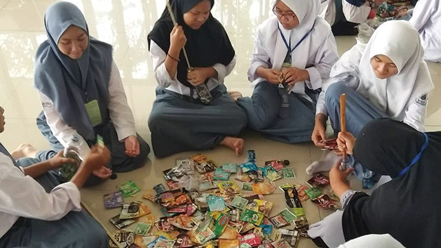 Pelajar menjalani pelatihan mengubah plastik bekas menjadi barang berguna seperti meja dan kursi. Foto: Ecobrick Bogor