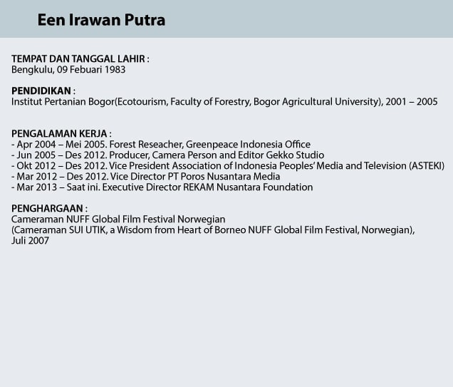 Selama delapan tahun di Telapak, Een mempelajari cara mengolah dokumenter dengan memadukan kemampuan analisis dengan visual. Ia juga aktif dalam menyuarakan isu tentang masyarakat adat dan lingkungan sejak kuliah. “Saya ingin menyampaikan ke publik bahwa banyak kasus yang tidak diberitakan,” ucapnya.