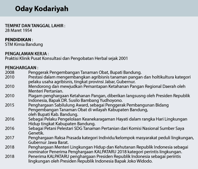 Sosok Oday Kodariyah merupakan perempuan berdaya yang memanfaatkan dan melestarikan keanekaragaman hayati Indonesia. Meskipun tidak mengenyam pendidikan mengenai pengobatan tradisional nusantara secara formal, tetapi ratusan bahkan ribuan pengetahuan tersebut telah ia pelajari.