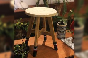 Bahan dasar kursi terdiri dari serbuk gergaji yang kemudian dikombinasikan dengan potongan polimer sintetik sehingga menghasilkan produk daur ulang.