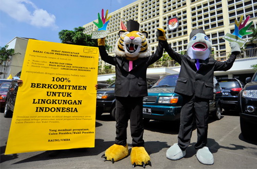 Jakarta (Greeners) – Hari ini, Jumat (16/05), aktivis Greenpeace mengantarkan Raung dan Umba ke Komisi Pemilihan Umum (KPU), Jakarta, untuk mendaftar menjadi Calon Presiden dan Calon Wakil Presiden. Keduanya mendaftar […]